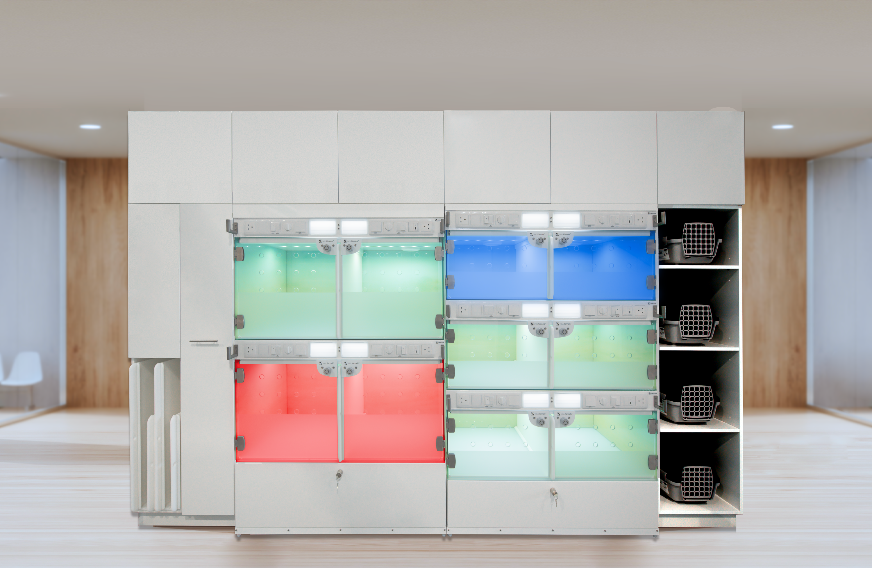 Glass has been shown to significantly decrease audible stimuli (Edwards et al., 2019a), lowering patient stress levels and improving clinical care. Glass also enhances patient visibility, enables more efficient monitoring and boosts biosecurity, compared to alternatives (International Society of Feline Medicine, 2024) – as well as offering better insulation and heating control, with customisable zoned heating and cooling areas aiding recovery.