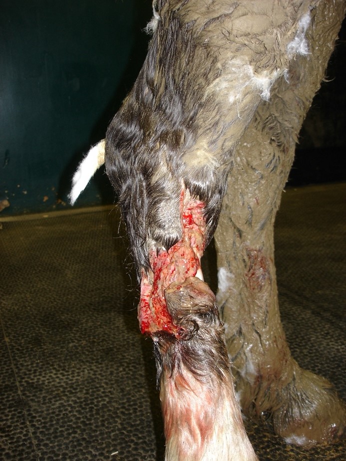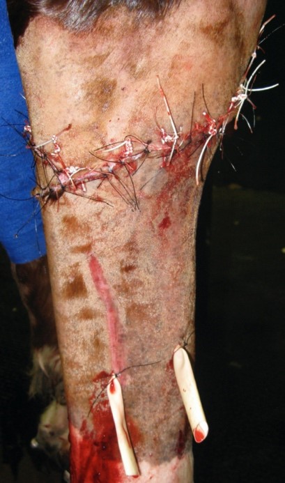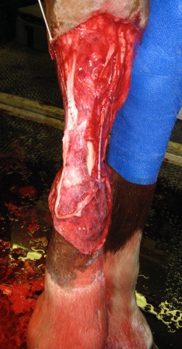 Contamination of the wound with hair, dirt and organic material complicates wound healing. Application of sterile gels to the wound before clipping and wound cleaning prevents additional contamination during this process. Wounds associated with contamination of synovial structures, bone damage or severe damage to other underlying structures are best managed in a hospital setting (Figures 6 and 7).