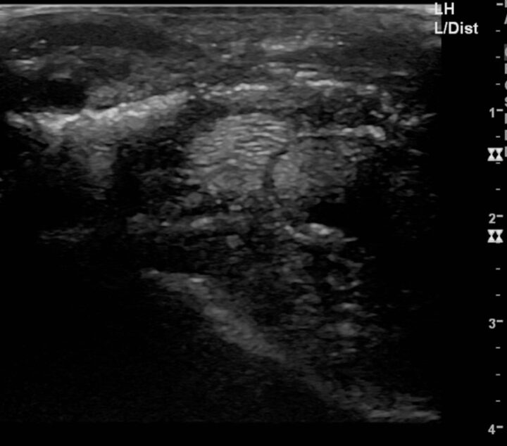 To accurately assess the depth, extension and size of acute wounds, clipping and cleaning are essential, particularly as the wound frequently extends further than anticipated before clipping (Figures 1 and 2). The use of radiographs and ultrasound can help determine involvement of, and damage to, underlying structures, demonstrate the presence of foreign bodies and give an indication of penetration of adjacent synovial structures. Gas within synovial structures may be observed as radiolucencies on radiographs (Figure 3) or hyperechogenicity on ultrasound scan, but they must be differentiated from superimposed subcutaneous gas/air within fascial planes (Figures 4 and 5).
