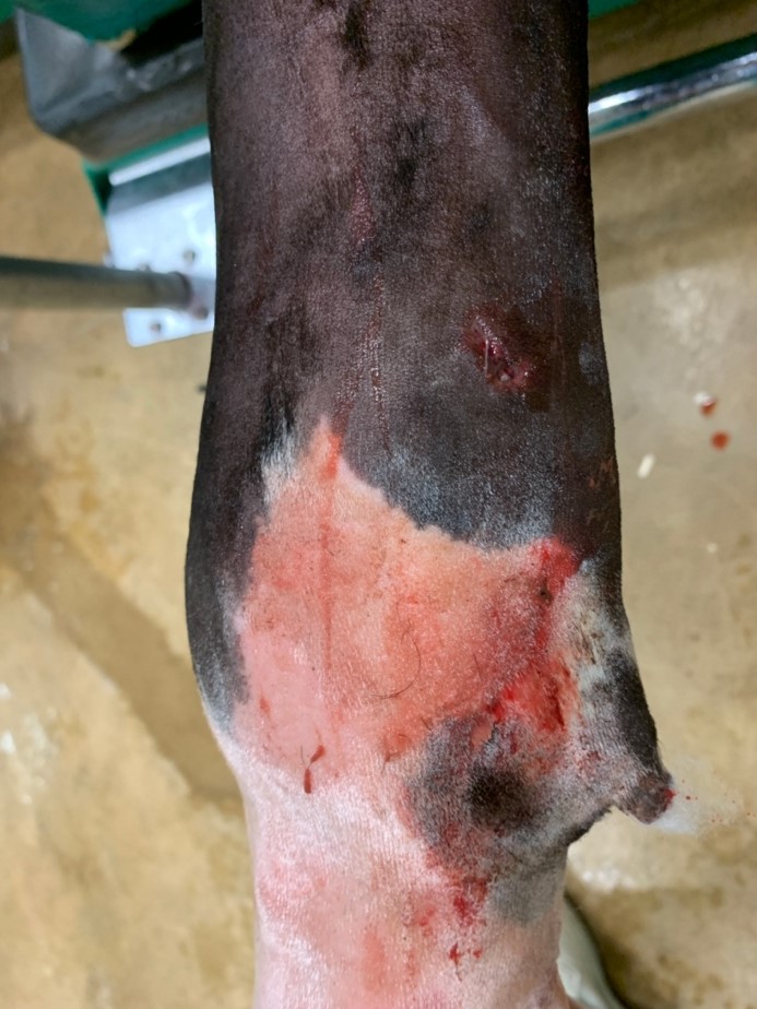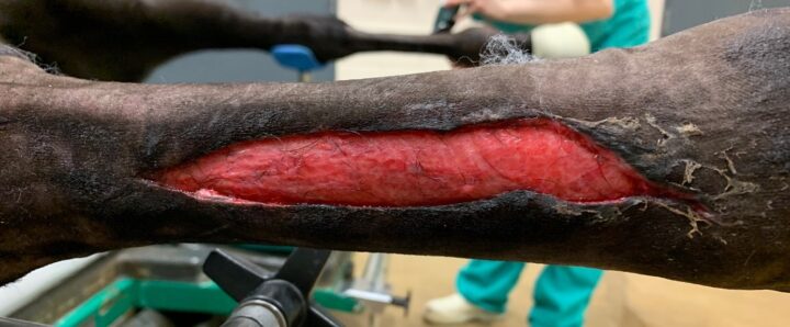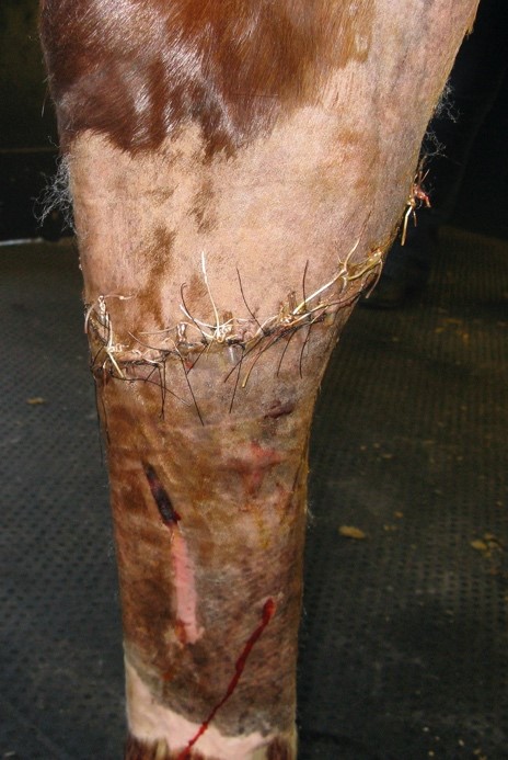To support and protect the wound repair, appropriate immobilisation is necessary in the immediate post-repair period to support the healing tissues and minimise movement, which will disrupt the initial stages of wound healing. This will vary according to anatomical location: a well-applied conforming bandage will be suitable for many distal limb wounds, but a splinted bandage or cast may be necessary to manage wounds over high-motion areas (such as heel bulbs or the dorsal aspect of the fetlock joint). It is essential, however, that the dressing itself does not cause further trauma to the skin and surrounding tissues, with even tension being essential to avoid iatrogenic skin trauma and rubs.