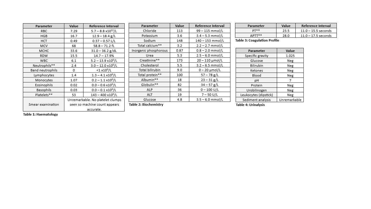 Physical examination: Barney is quiet, alert, responsive. Mucous membranes are pink and moist with a capillary refill time of 2 seconds. Heart rate is 116 beats per minute with no murmur or dysrhythmia noted. Respiratory rate is 24 breaths per minute with normal effort; auscultation is unremarkable. Abdominal palpation is comfortable but reveals moderate splenomegaly. Peripheral lymph nodes are within normal limits. Rectal temperature is 38.4C. Rectal examination is unremarkable. Body weight is 32.7kg with body condition score of 5/9 and muscle condition score of 2.5/3. There is an intermittent 3/10 lameness in the left pelvic limb; palpation elicits discomfort possibly in the femoral region but is hard to localise precisely. A photograph of the fundic examination (left eye) is attached below.
