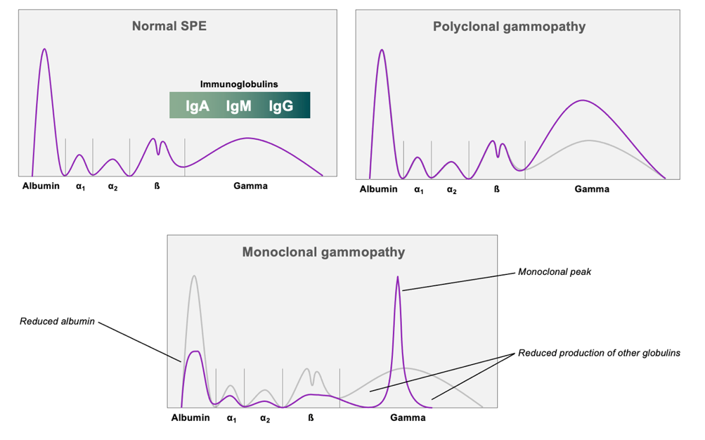 - See the image attached that show a normal SPE result and a polyclonal gammopathy.